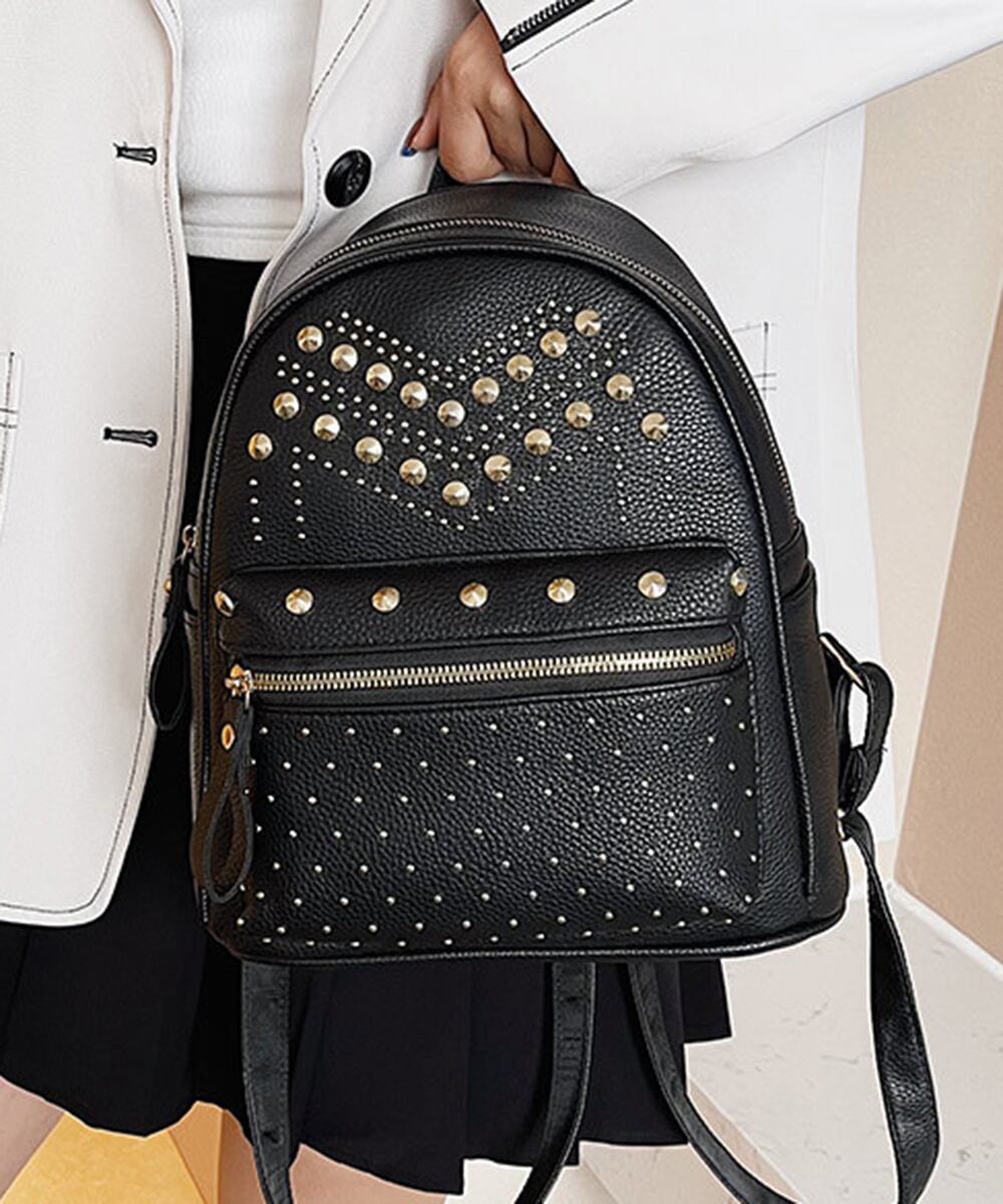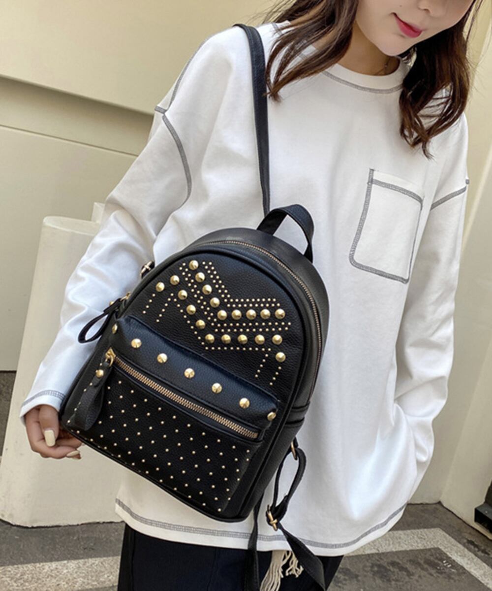 このリュックサックは、シンプルながらもスタッズがきらりと光るデザインが魅力で、どんなスタイルにも合わせやすいアイテムです。荷物をしっかり収納しながら、おしゃれを楽しむお手伝いをします。ぜひあなたの日常に取り入れてみてください!
